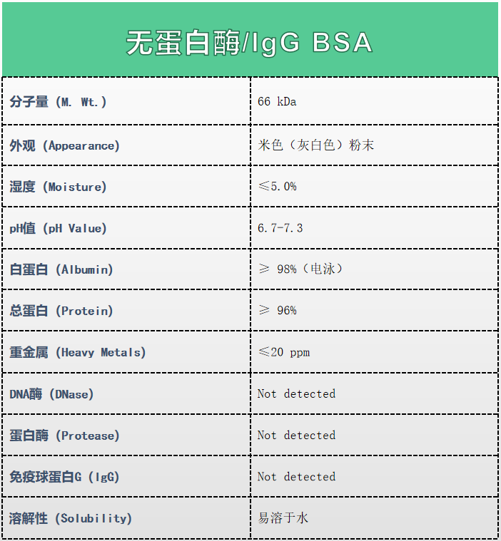 不含有蛋白酶以及RNase酶活性,同時(shí)不含IgG,純度等級更高,作為封閉液或稀釋液應(yīng)用于EIA和ELISA等實(shí)驗(yàn)中。